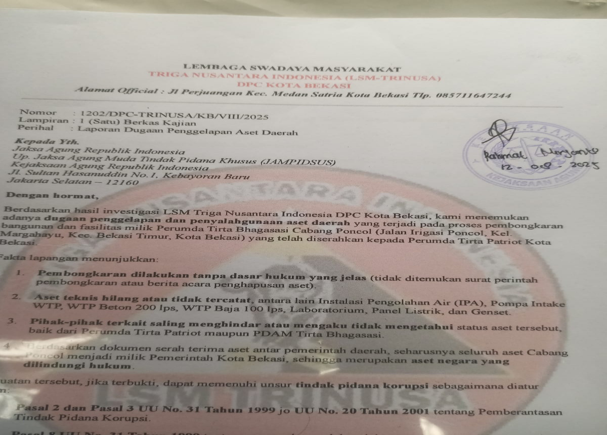 PorosBekasi.com – Kelompok masyarakat Triga Nusantara (Trinusa) Bekasi Raya resmi melaporkan dugaan penggelapan aset negara terkait pembongkaran fasilitas, yang sebelumnya milik Kantor Perumda Tirta Bhagasasi Cabang Poncol, Jalan Irigasi Poncol, Margahayu, Bekasi Timur, Kota Bekasi.