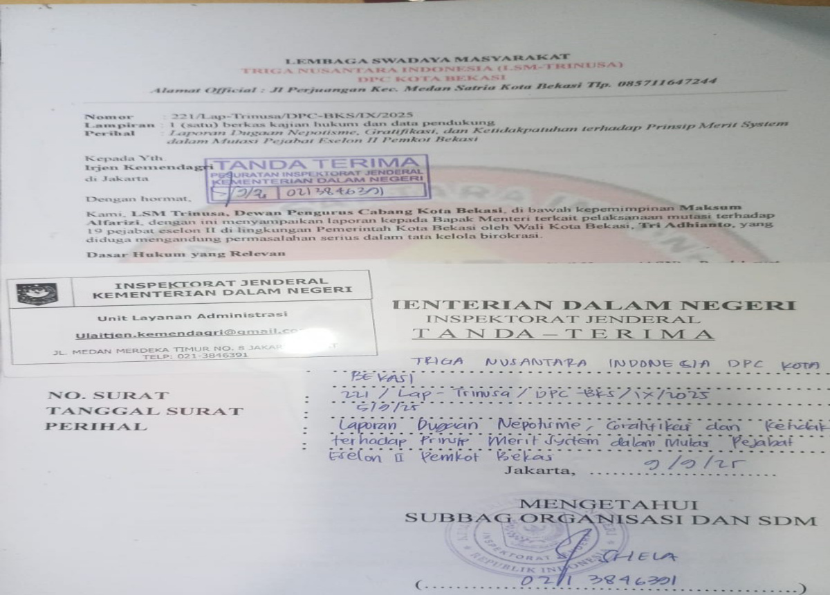 PorosBekasi.com – Dugaan nepotisme pada rotasi pejabat eselon II di Pemerintah Kota Bekasi kian memanas. Terbaru, Kelompok masyarakat Trinusa Bekasi Raya resmi melayangkan laporan ke Inspektorat Jenderal (Irjen) Kementerian Dalam Negeri (Kemendagri).