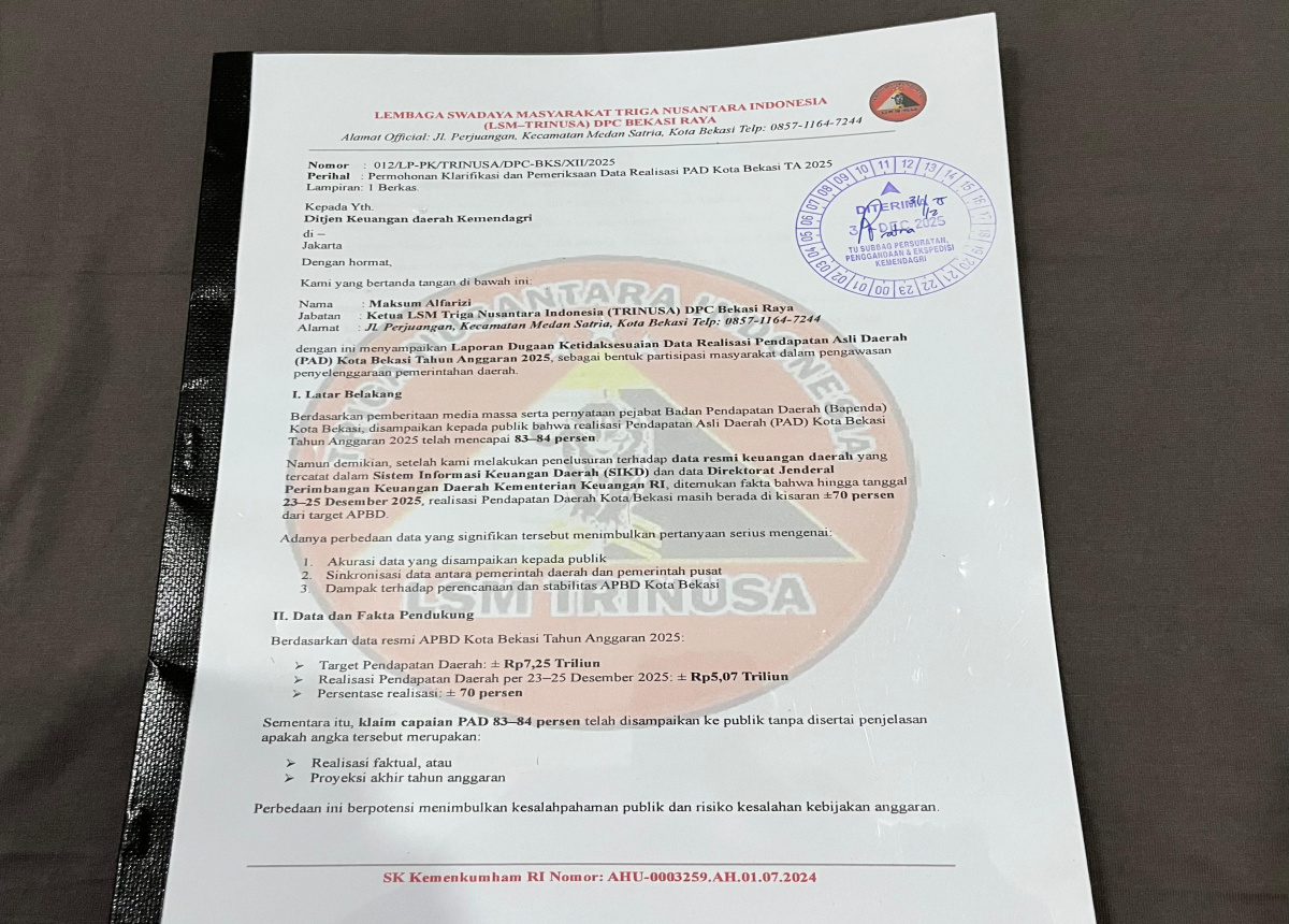 Kelompok masyarakat Trinusa Bekasi Raya menilai angka tersebut patut dipertanyakan dan berpotensi bermuatan kepentingan tertentu menjelang penutupan buku APBD akhir tahun.
