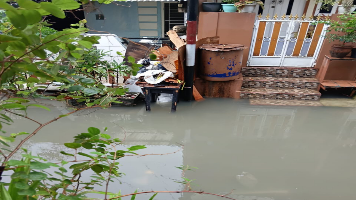 Salah satunya di RT 02 RW 30, Kelurahan Pengasinan. Jalan lingkungan berubah menjadi sungai. Warga tak lagi bisa keluar sejak subuh, terkurung genangan yang membentang tepat di depan rumah mereka.